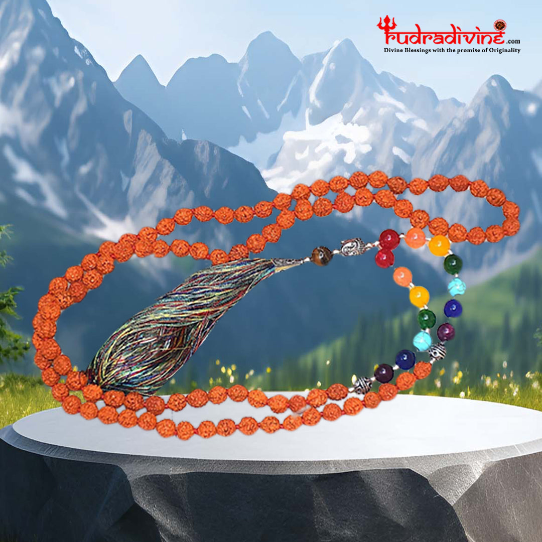 This 7 Chakra ans 5 mukhi Rudraksha Mala with Alloy Bracelet Stimulate the balancing of your chakras by using this Chakra mala. There are seven energy centers in the body that are known as the chakras. They are located along the spine and each has specific associations. Ultimately, to be a balanced and healthy person in mind, body, and spirit, all of the seven chakras should be open and in balance with each other and be allowing energy to pass through them freely.The only essential feature of a chakra Mala is that its wearer understands its significance. Not every rainbow colored bracelet is a chakra bracelet, but all bracelets colored this way can be worn as chakra bracelets and thereby achieve the intended balancing and healing effects.The beads in a chakra Mala can be made of many materials, but the colors are very important. Each of the chakras is represented by a color — violet/white, indigo, light blues, green/pinks, yellows/browns, orange, and reds.The only essential feature of a chakra bracelet is that its wearer understands its significance. Not every rainbow colored bracelet is a chakra bracelet, but all bracelets colored this way can be worn as chakra bracelets and thereby achieve the intended balancing and healing effects