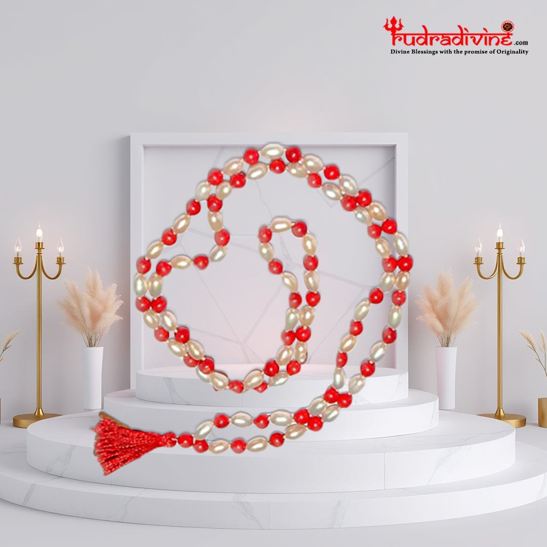 This mala is Beautiful cambination of Red Coral (Moonga) & Pearl (Moti)
