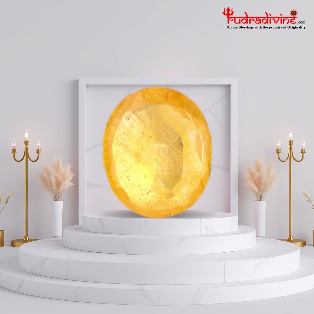 Yellow Sapphire is a highly precious, yellow colored gemstone of the Corundum mineral family. It is one of the most recognized gemstones in vedic astrology worn for professional success, marital bliss, improved will power and healthy progeny. . Yellow sapphire found in colors like yellow. It represents Jupiter planet and Its semi-gems is yellow agate and Golden Topaz.