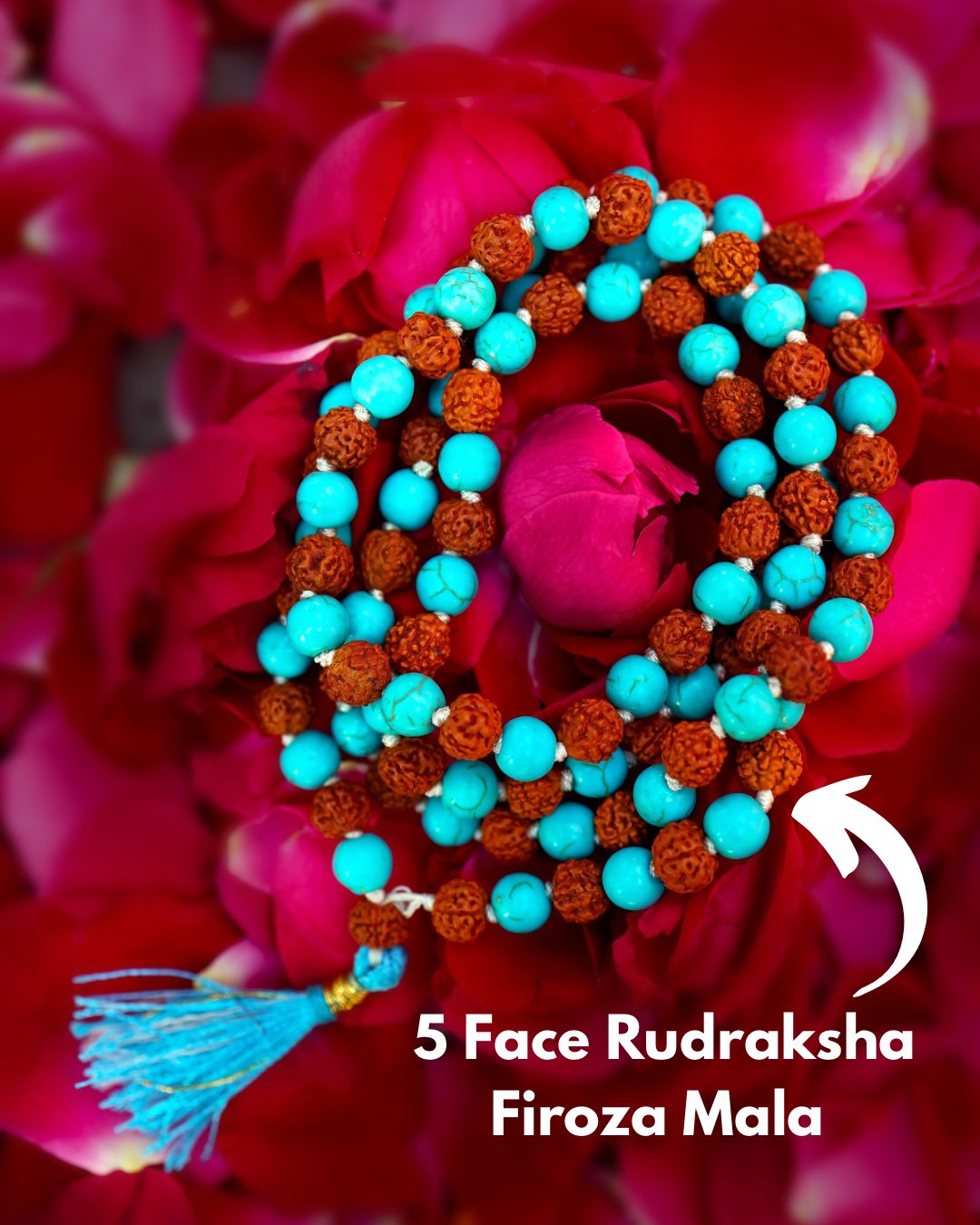 5 face rudraksha mala with Turquoise is a blue-green to green mineral that is commonly used as a gemstone in jewelry. The name "turquoise" is derived from the French word "turquois," meaning "Turkish," as the gemstone was originally brought to Europe through Turkey. Turquoise has been valued for centuries and has been used by various cultures for ornamental and spiritual purposes. It has been associated with protection, good fortune, and healing properties in different traditions. Wearing Turquoise stone brings good luck to the wearer's life. This crystal helps in maintaining stability in married life by creating a deep understanding between the partners. It brings stability and control to a person's life. It also helps to bring out the person from the negative energies around him. This stone has often been associated with protection, luck, and abundance. In many cultures, it is believed that wearing turquoise can ward off negative energies and bring good fortune. The stone is also seen as a symbol of friendship and unity, making it a popular gift among loved ones.